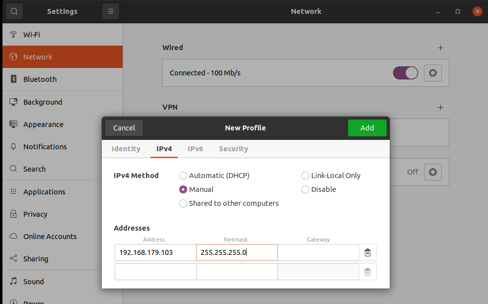 3) Go to the IPv4 tab and set IPv4 Method to Manual.