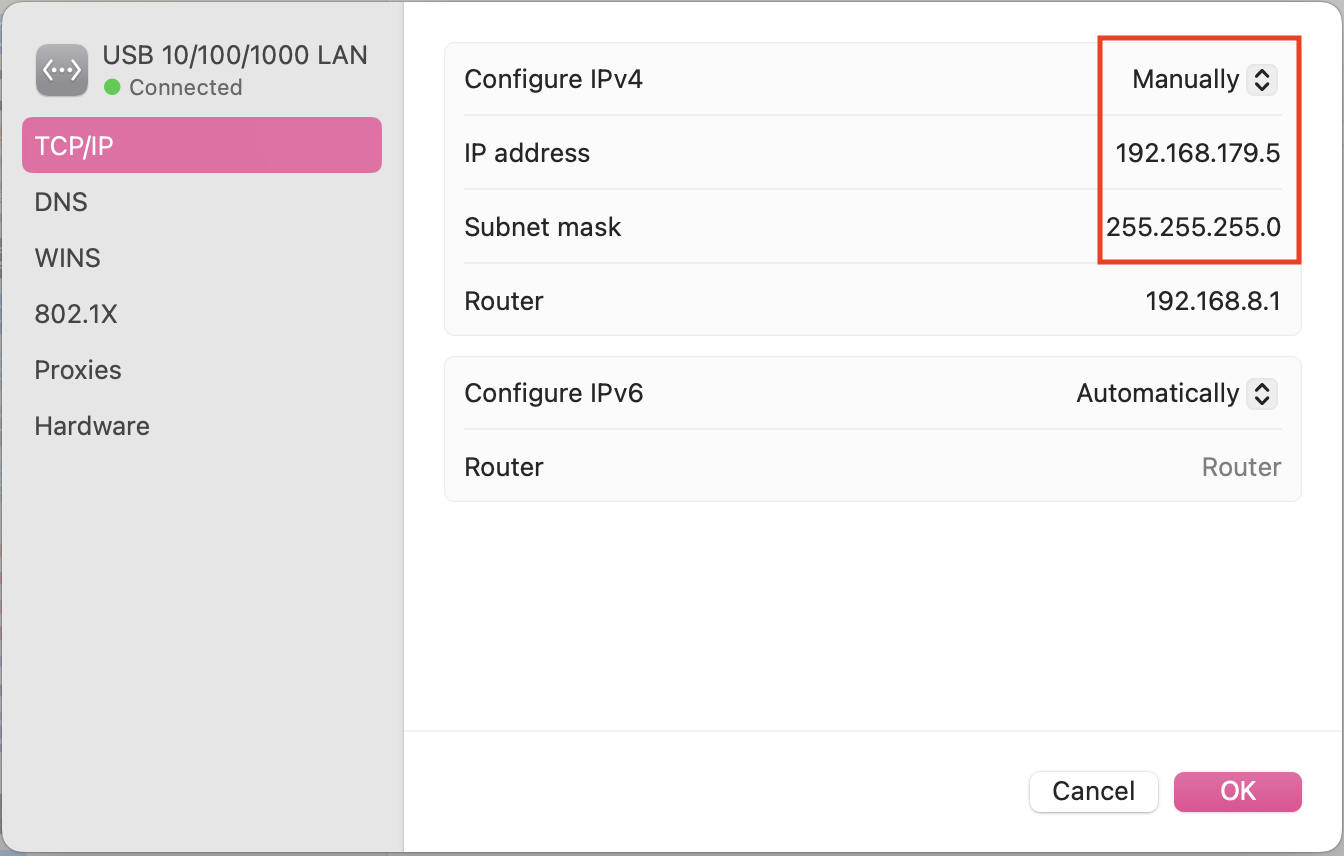 To connect your Mac directly to a NEPI device over Ethernet, you will configure your Mac's Ethernet adapter with a static IPv4 address on the same subnet as the NEPI device. NEPI devices use the default subnet 192.168.179.0/24 and the device IP 192.168.179.103.Example Static Network Settings for macOS