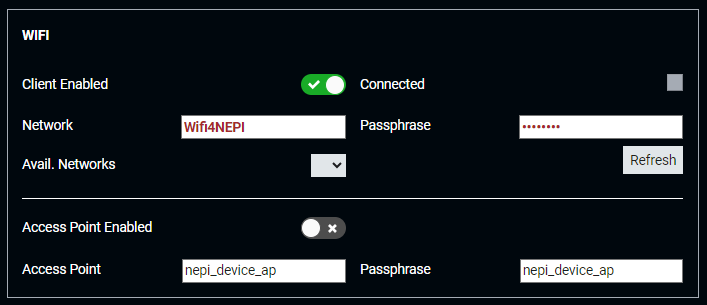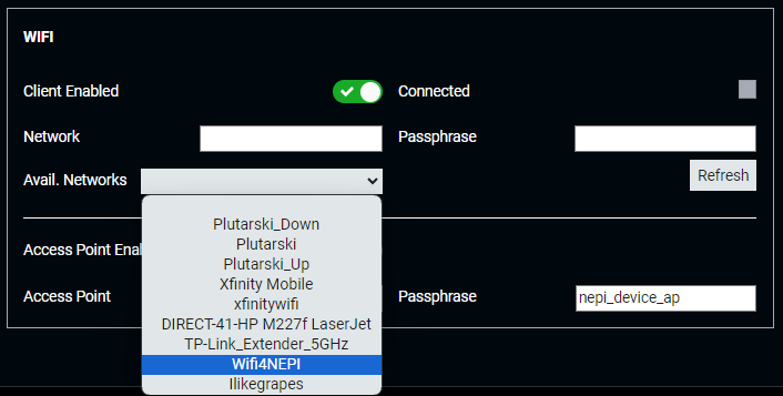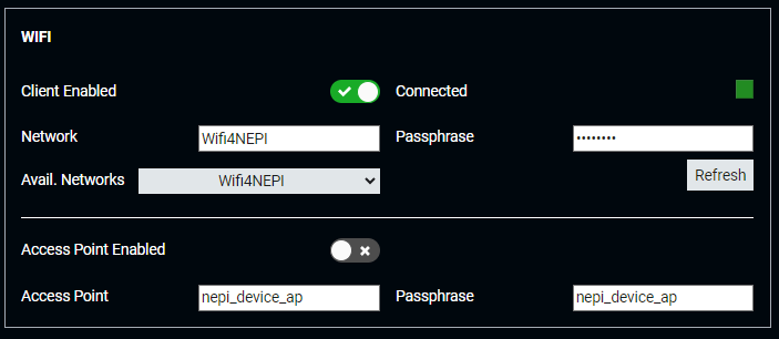 If your NEPI device has either an integrated WiFi board or you have a WiFi USB adapter attached, you will see a WIFI section available under the ETHERNET section on this page. If you want to connect to the internet through an available WiFi network, click the Client Enabled switch, wait for the "Available Networks" dropdown box to populate, then select the WiFi network you want to connect too, and enter the WiFi password in the "Passphrase" box. Be sure to hit return after entering the password. If the NEPI software was able to connect with the password you entered, you should see the "Connected" indicator turn Green. If the WiFi network you connected to has internet access, you should see the "Internet Connected" indicator above the "Ethernet" section turn Green as well.