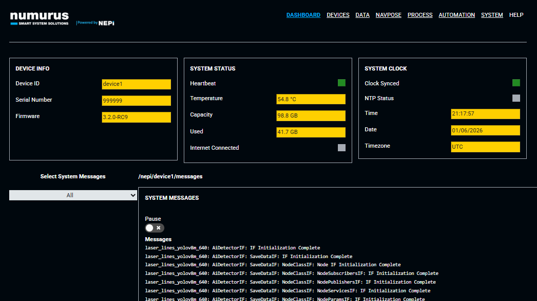 NOTE: While the RUI provides a convenient user interface to the NEPI software system, all of the data and controls you see have documented backend API interfaces (ROS and HTML) for automation programming and interfacing to a connected system.