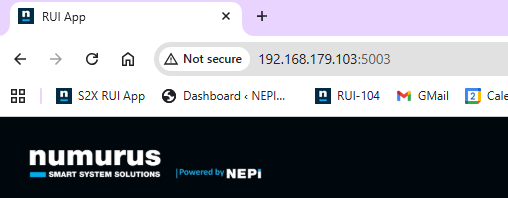 Now that the PC and NEPI device are communicating, we need to connect to the NEPI device's Resident User Interface or RUI, which is a browser-based interface hosted on the NEPI device, that provides system monitoring and setup, since in most cases, the NEPI device will be embedded in a larger system with no display, keyboard, or mouse attached. 1) For this step, you just need to open a web-browser on our PC and enter the NEPI device's IP address and RUI port number: http://192.168.179.103:5003 NOTE: The current version of the RUI does not include a self certified SSL certificate, so the link will display a "Not Secure" message.