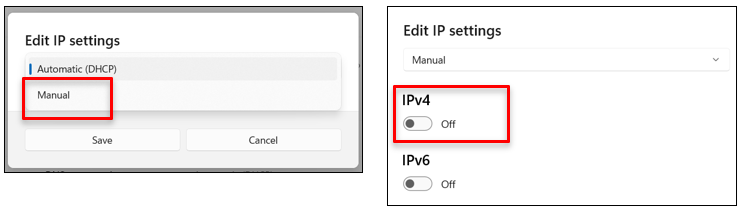 4) Select the "Manual" option then turn on the "IPv4" switch in the popup window that appears.