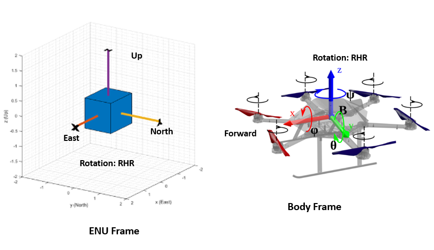 Local Body Frame (Fixed to Robotic Platform Body): X axis points in Forward (defined by geometry and not by movement) direction (RHR roll axis), Y axis points to the Left (geometrically) (RHR pitch axis), Z axis points Up (geometrically) (RHR yaw axis), Yaw 0 degrees faces X and rotates positive using right hand rule around Z axis down.